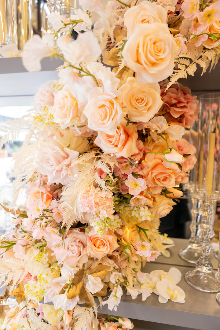 In a soft pastel scheme that exudes elegance and femininity, we worked primarily with classic wedding flowers. Beautiful blousy garden-style Roses in many tints and tones of pale pink, apricot, cream and white dominate the floral displays while Yevnig adorned her cakes with the most exquisite hand-made sugar Roses and Orchids so that the cake and the florals merge seamlessly together becoming one harmonious, ethereal dream of spellbinding beauty.