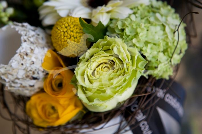 Easter floral arrangement in a container with Roses, Viburnum Opulus, Craspedia, twigs and accessories.