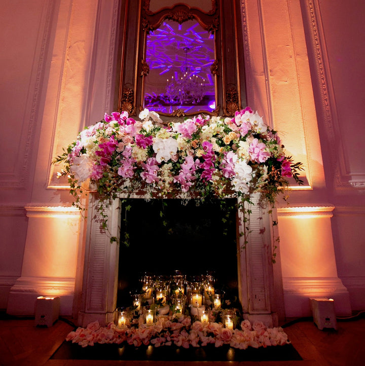 For a recent engagement party at One Belgravia, we adorned the venue with two opulent fireplace designs which were also to be used as a backdrop for photos, and an extravagant staircase design leading up to the party room. The clients had dreams of Roses and Orchids in a soft, romantic colour palette, so we contacted some of our favourite champion growers, Meijer Roses, Ichtus Phalaenopsis and Ansu Vanda (formerly known as Anco).