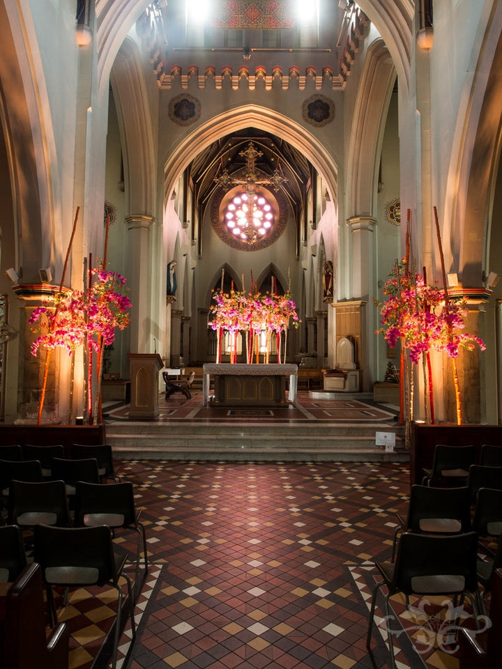 The inspiration for the form, the colour scheme and flower choice of my floral installation at the High Altar came primarily from the majestic space, the Gothic forms, the deep reds, oranges and gold that are the dominant colours in the cathedral and typical of that era. These factors were important features to consider in the design.