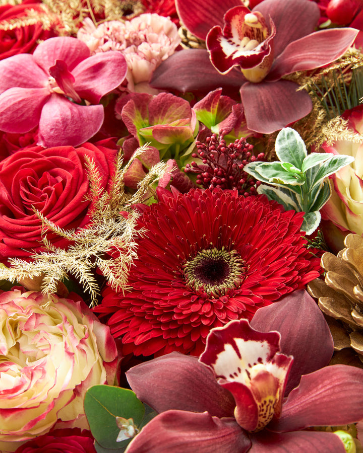 Our “Merry & Bright" collection draws upon the season’s most iconic colours with a lush mix of Amaryllis, Gladioli, Roses, Orchids, and Ilex Berries. Enhanced with gilded pinecones, shimmering foliages, and birch twigs, each design embodies the holiday spirit with a radiant, nostalgic feel. Fragrant winter greens—scented spruce and pine—infuse each design with a delightful seasonal aroma, evoking cherished memories of Christmases past.
