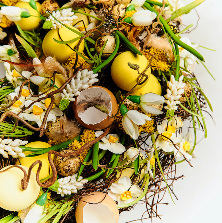 I am excited to introduce this season a completely new design, a spring wreath which can be hung on a door, like a Christmas wreath, or on a wall indoors or out, or even placed on a table. Exceptionally elegant, this wreath suggests a bed of spring growth, with delicate fragrant blooms, Muscari 'Grape Hyacinths,' Narcissi, Leucojum (resembling Snowdrops) and fresh green shoots emerging in abundance from a ring of textured twigs and moss. Decorative eggs and a few feathers gently remind us of Easter enhancing the reassuring sense of rebirth and new beginnings.