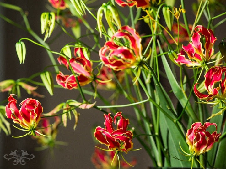 Floral styling begins with sourcing the right flowers from the best growers. So let's see how this fabulous flower, Gloriosa, grows. There are three growers in Holland. Here you can see the "glasshouse" of grower, Richard van Ruiten. The plants grow up to 3 meters tall. The short (20/30 cm) stems of Gloriosa flowers are cut and sold as the plant establishes itself and grows taller. The upper part of the plant is cut and sold as 60 cm to 1m long stems bearing several flowers. These long stems are exciting for a floral designer with their long, slim, sturdy stems, flowers creating bright bursts of colour, the soft green buds and the curving, curling leaves..